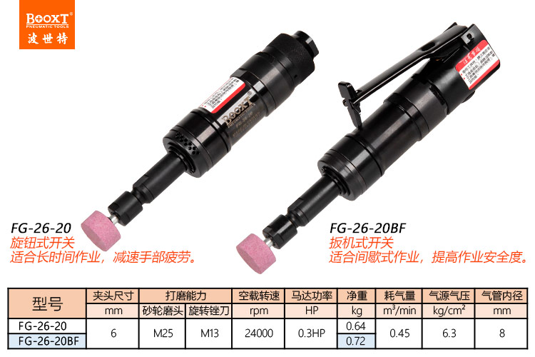 東莞市強勁五金工具有限公司提供臺灣BOOXT波世特品牌氣動工具,氣動打磨機FG-26-20BF廠家直銷,首件享特價。咨詢熱線:4008301980