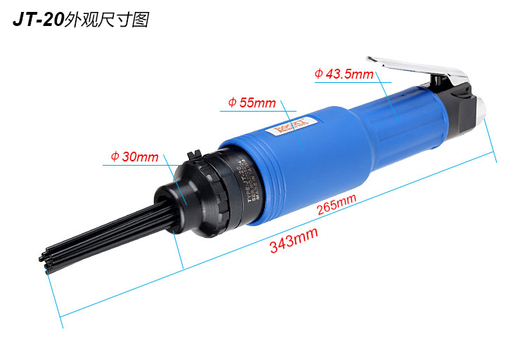 • 產品參數: 沖擊頻率:4000b/min 活塞直徑:M20*56L 活塞沖程:29mm 槍針數量:12針 槍針直徑:M3*180L 耗 氣 量:4cfm/min 全 長:343mm 凈 重:2.30kg 【工業型】
