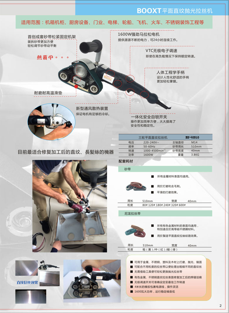 1)適用于機(jī)箱機(jī)柜、廚房設(shè)備、門(mén)業(yè)、電梯、輪船、飛機(jī)、火車動(dòng)車、不銹鋼裝飾等平面直紋拋光拉絲作業(yè)。