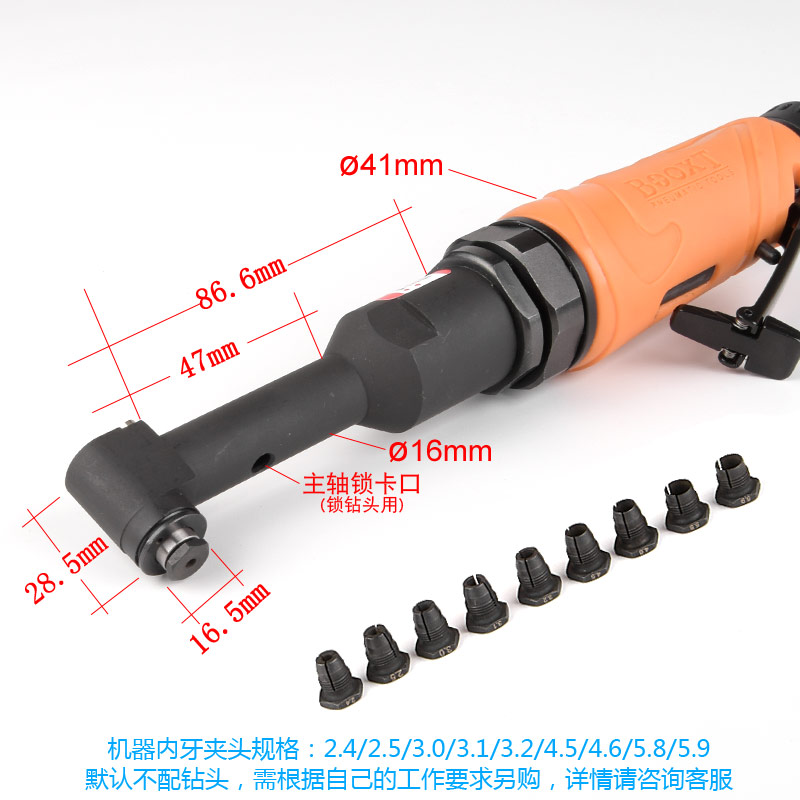 • 產品參數: 夾頭螺牙:9/32"*40T 夾頭尺寸:2.4/2.5/3.0/3.1/3.2/4.5/4.6/5.8/5.9(選配,其他規格可定制) 空載轉速:4000rpm 馬達功率:0.3HP 彎角高度:28.5mm 全 長:240mm 重 量:0.64kg 耗 氣 量:84L/min