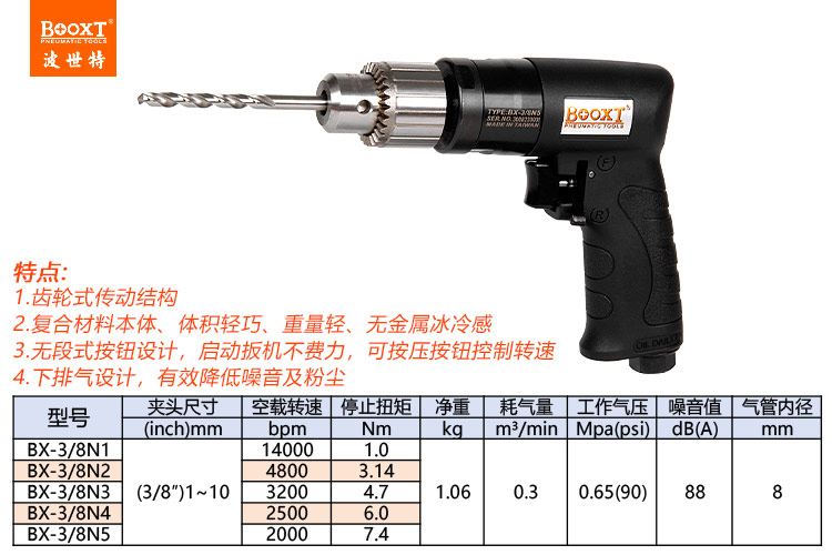 東莞市強勁五金工具有限公司提供臺灣BOOXT波世特品牌氣動工具,工業(yè)級氣鉆BX-3/8N4廠家直銷,首件享特價。咨詢熱線:4008301980