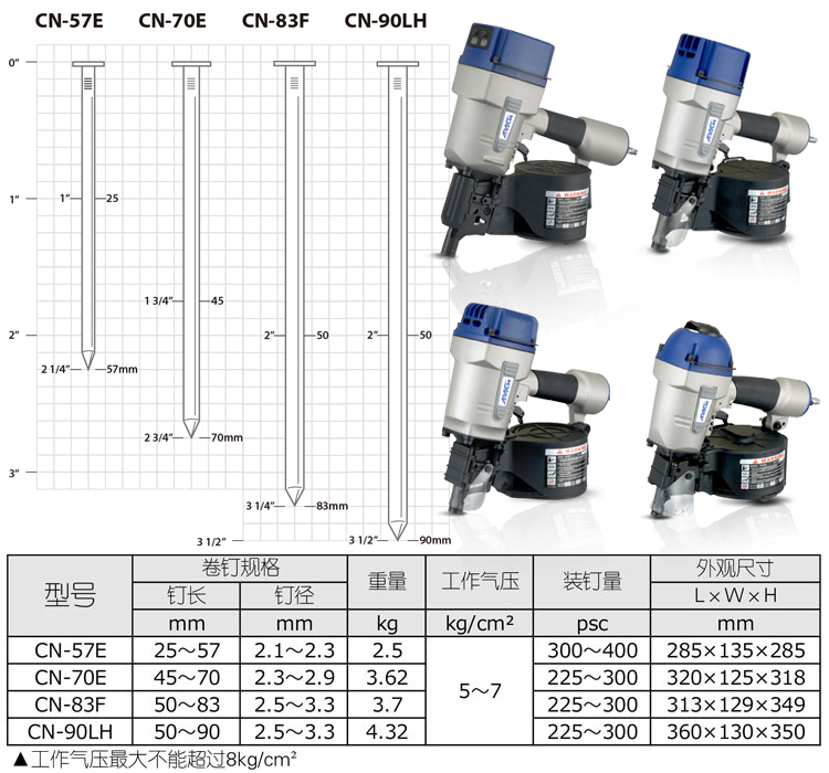 臺灣氣動卷釘槍CN-70E特點: