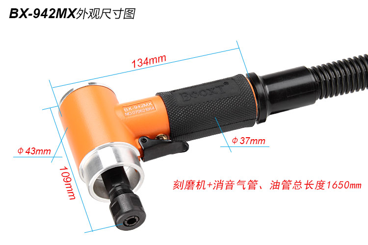 • 產品參數: 夾頭能力:標配M6 (可選配M3) 空載轉速:15000rpm 耗 氣 量:0.38M3/min 全 長:1650mm 重 量 : 0.86kg 【帶消音功能】