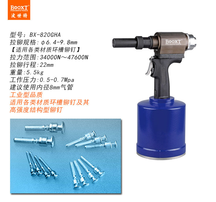 東莞市強勁五金工具有限公司提供臺灣BOOXT波世特品牌氣動工具,氣動環槽鉚釘槍BX-820GHA廠家直銷,首件享特價。咨詢熱線:4008301980