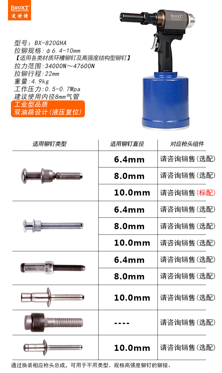 4.品種齊全,適合不同規格,不同強度的鉚釘。
