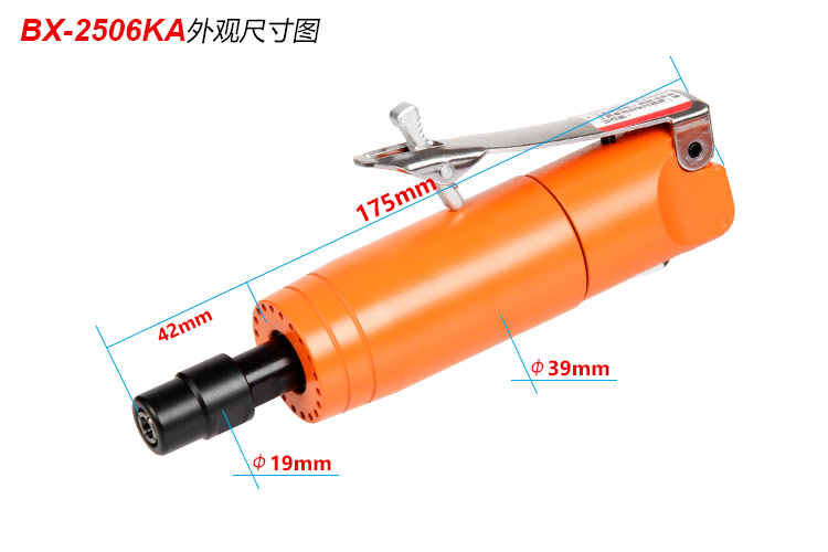 • 產品參數: 夾頭能力:M3,M6 (標配M6) 空載轉速:24000rpm 耗 氣 量:0.45m3/min 全 長:175mm 重 量 : 0.70kg【工業型/扳機開關】
