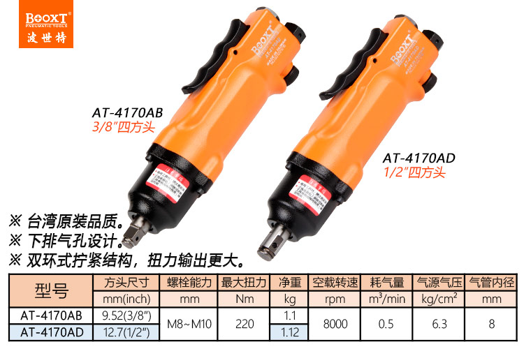 東莞市強勁五金工具有限公司提供臺灣BOOXT波世特品牌氣動工具,直柄氣動扳手AT-4170AB廠家直銷,首件享特價。咨詢熱線:4008301980