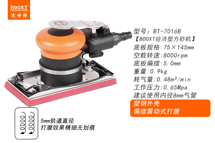 • 產品參數: 底盤尺寸:75*145mm 空載轉速:8000rpm 偏擺直徑:5mm 重 量:0.90kg 耗 氣 量:0.48m3/min 【經濟型】