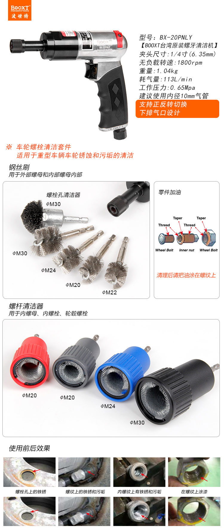 • 產品用途: 適用于車輛車輪螺栓螺牙的鐵銹、污垢清理作業。
