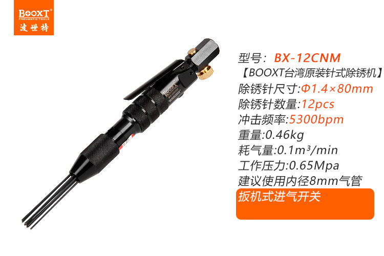 • 產(chǎn)品參數(shù): 沖擊頻率:5300bpm 除銹針數(shù)量:12pcs 除銹針尺寸:M1.4*80L 耗 氣 量:0.1m3/min 全 長:245mm 凈 重:0.46kg 【迷你型】