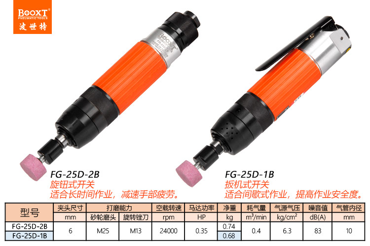 東莞市強勁五金工具有限公司提供臺灣BOOXT波世特品牌氣動工具,高精度氣動直磨機FG-25D-1B廠家直銷,首件享特價。咨詢熱線:4008301980