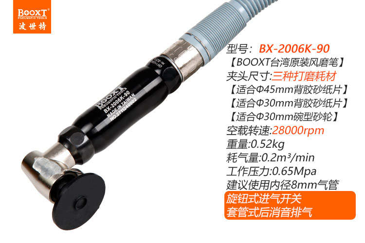 東莞市強勁五金工具有限公司提供臺灣BOOXT波世特品牌氣動工具,彎頭氣動風磨筆BX-2006K-90廠家直銷,首件享特價。咨詢熱線:4008301980