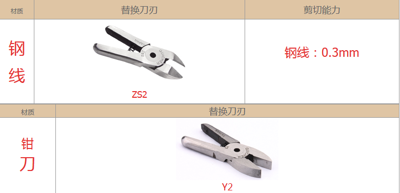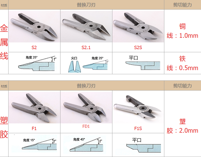 2.注意材質:材質對選配刀刃非常重要,例如客戶要剪的銅鐵、材質有鍍鈦、鍍烙、塑料材質、加纖維超過20% 時,一般刀刃不是剪不斷,就是使用壽命大大減少,塑料還容易在剪斷過程中碎裂。在這情形S刀刃應選擇Z刀,塑料則建議使用電熱剪。